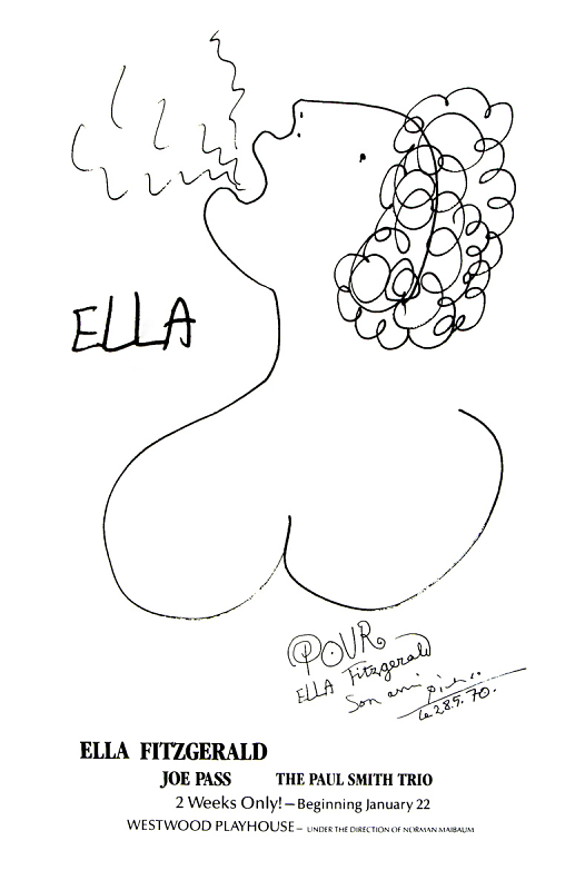 El dibujo que Picasso dedicó a Ella -fechado 28 de mayo de 1970- sirvió para ilustrar los carteles de algunos de los conciertos que nuestra cantante favorita ofreció junto al guitarrista Joe Pass, con quien grabó hasta tres álbumes en la fase crepuscular de la prodigiosa carrera.